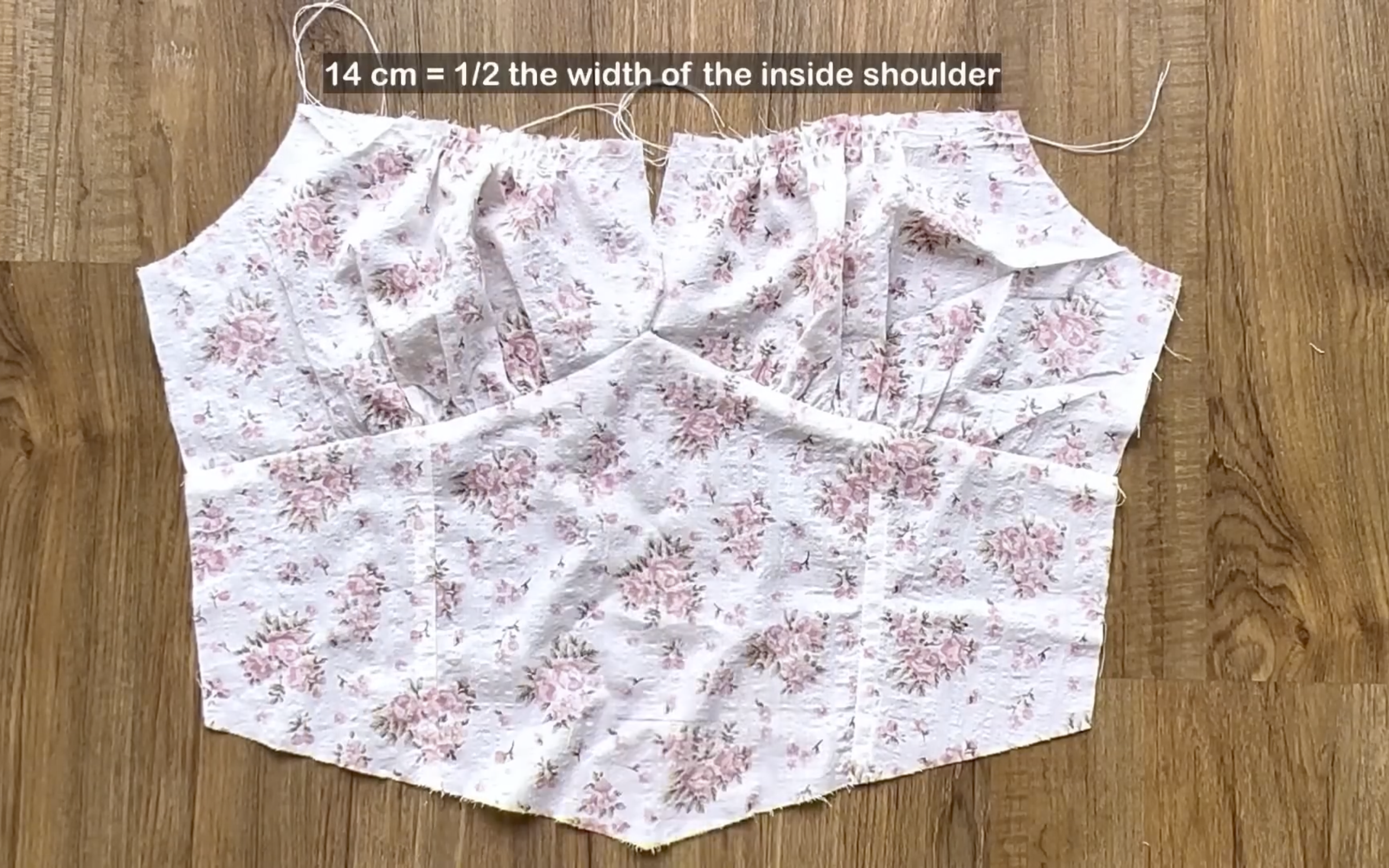 The final width of the gathering fabric will be 14 cm, which is a half of the inside shoulder.