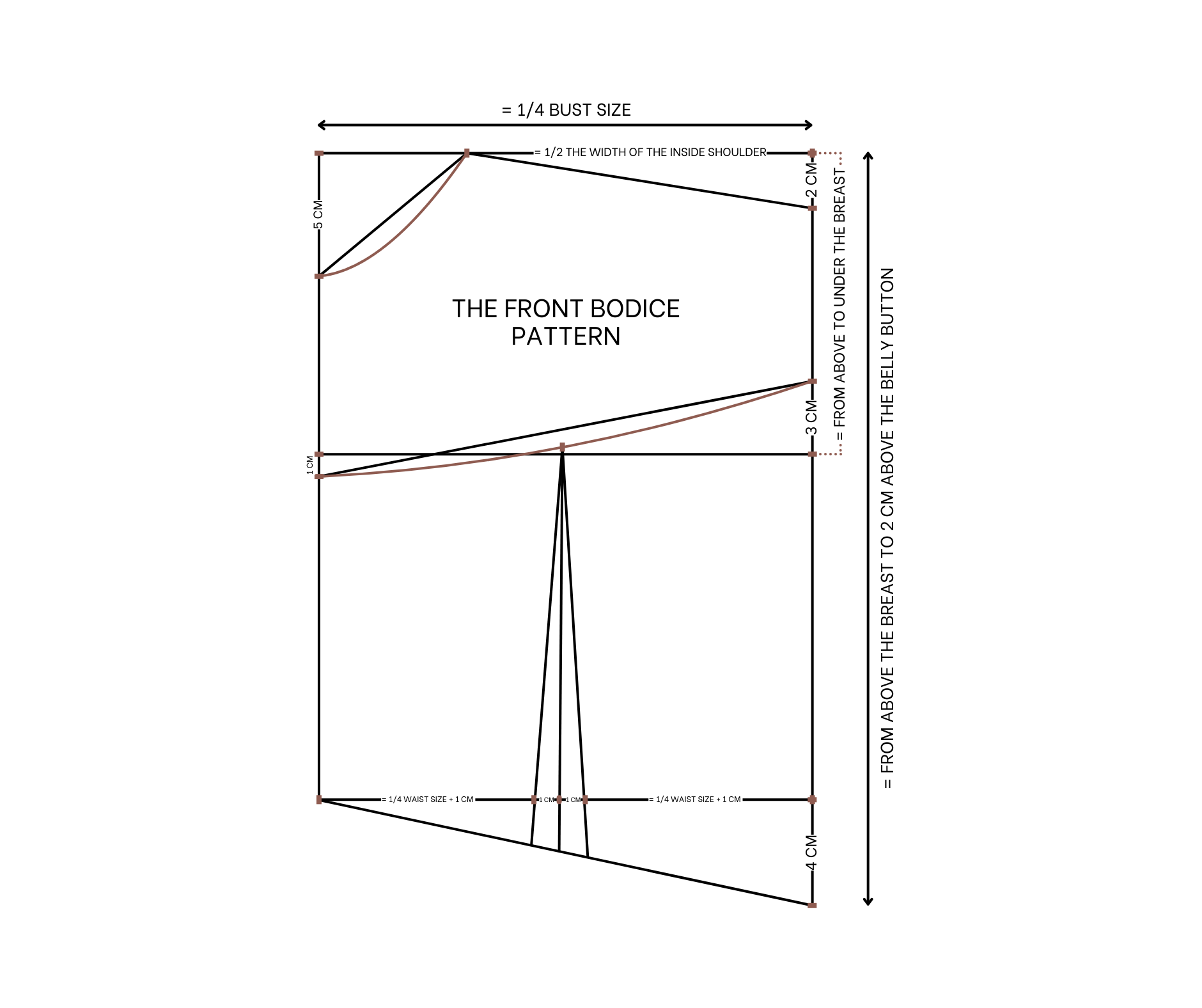 To make the front bodice pattern, draw a rectangle with a 20 cm width (a quarter of bust size) and a 26 cm length (from above the breast to 2 cm above the belly button).